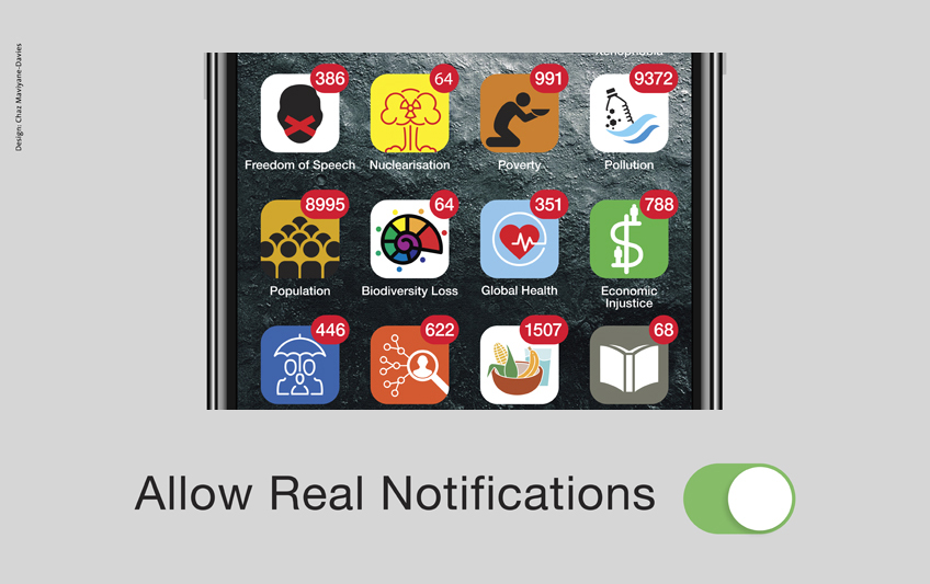 Allow Real Notifications is a poster designed by Chaz Maviyane-Davies to confront an interface-savvy generation through their own curiosity and behaviour, to hopefully consider and act on some of society’s toughest problems.
