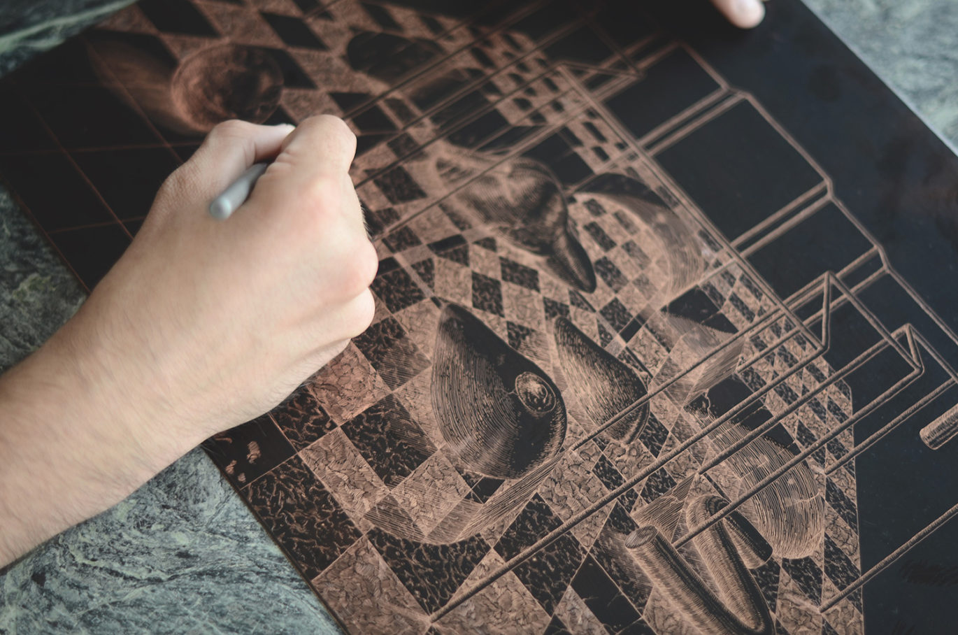 Meanwhile, Ugo prepared a sketch of his composition, which he placed over the copper plate before engraving it. He quickly adapted himself to the use of the stylus. The copper was exposed, the first lines started appearing. At the end of the first day, the outline of his drawing was engraved.