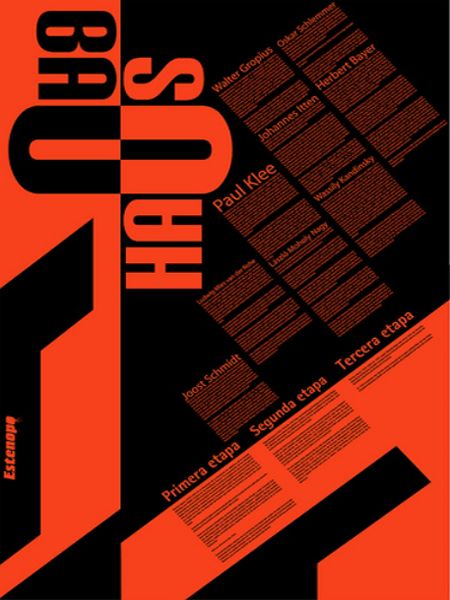 It wasn’t until the summer of 1923 when a poster was made for the school of Bauhaus that intrigued others to notice the unique typeset and design. Effective visual communication was a main focus when designing. You will see a balanced layout, vibrant colors, harmony, geometric shapes strong bars, bold and universal type. Using upper case or lower case fonts, but not a combination of the two, the typeset was clear and concise. The type was laid out in various ways. In addition to being horizontal and vertical orientation, Bauhaus is well-known for placing text at angles and also wrapping text around objects.