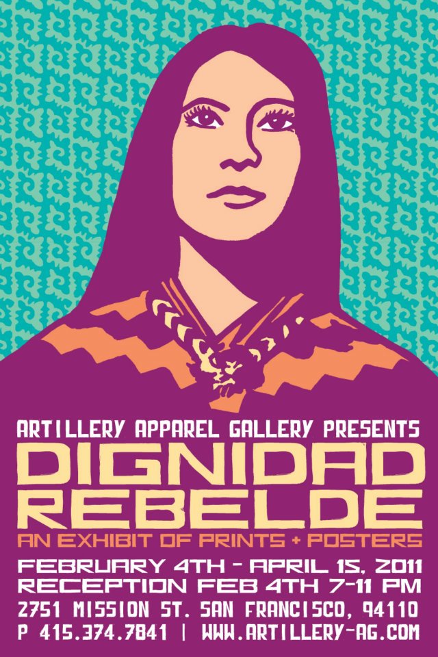 Feb 4, 2012 to Apr 15, 2012Artillery AG presents Dignidad Rebelde, a graphic arts collaboration between artists Melanie Cervantes & Jesus Barraza. Emerging from the everyday struggles of Raza & Indigenous people’s stories into a radical visual language which is then returned to those who inspired it in the first place. Working primarily as poster artists, DR continues working in an important artistic tradition deeply rooted in popular social movements throughout the Americas.