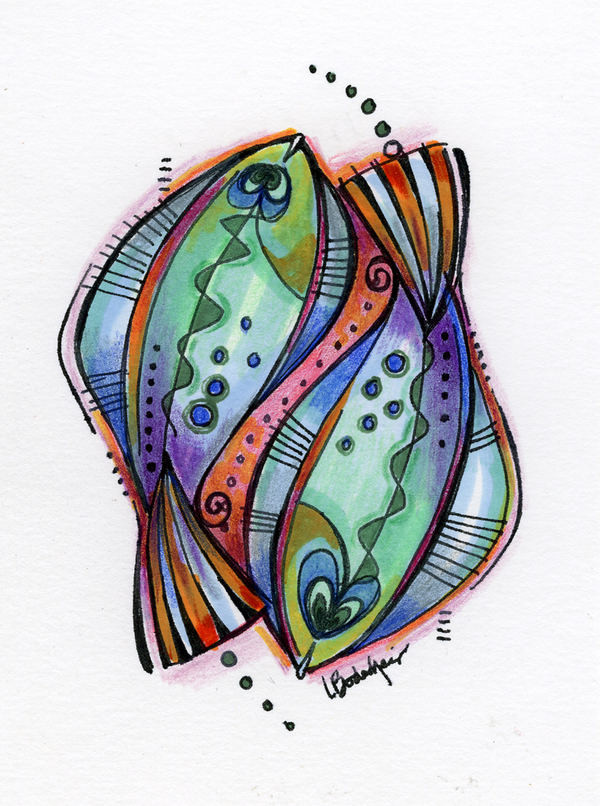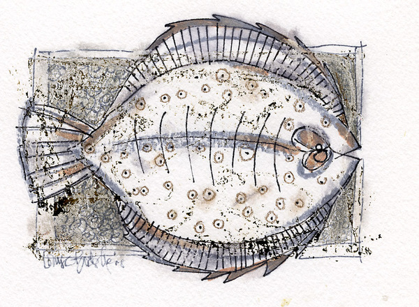 Louise McLean Bodenheimer, a designer/illustrator from Missuri, US, has a favorite motif for her creative meanderings. The Fish. This collection has a lot of flounders, some older, some newer, mostly small works, fun drawings on paper and digital explorations.