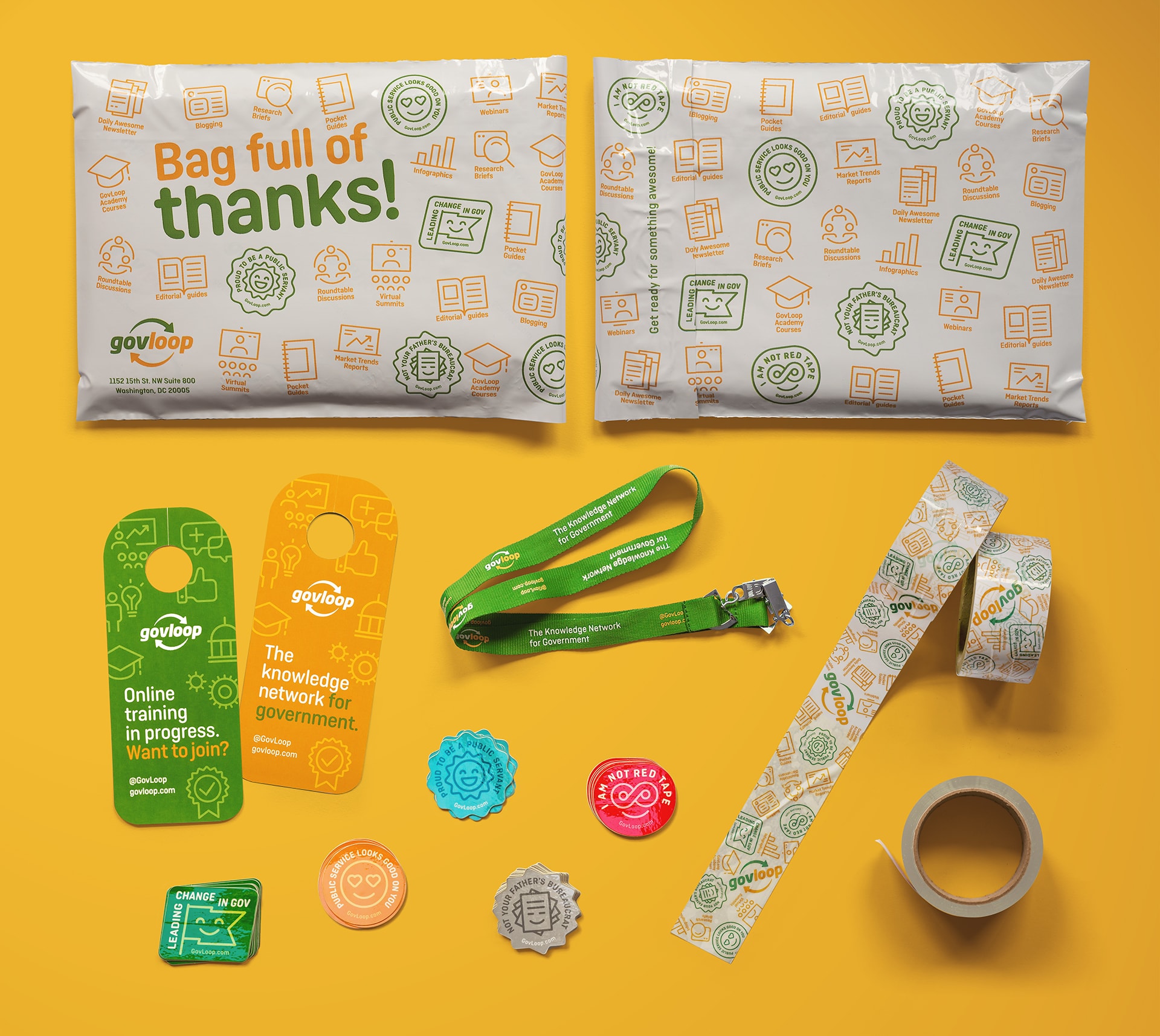 GovLoop’s signature t-shirts and stickers are intimately related to the corporate culture, its philosophy and its tone of communication, friendly and fun. They are a key product that has accompanied each of the events, publications and mailings made since its founding. Furthermore, the preparation of promotional mailings is a tradition performed by the new staff and interns at GovLoop and serves as a welcoming, integrating, fellowshipping and learning activity of the company’s values.