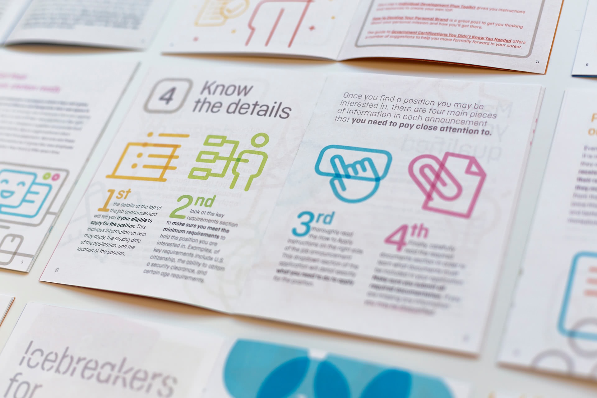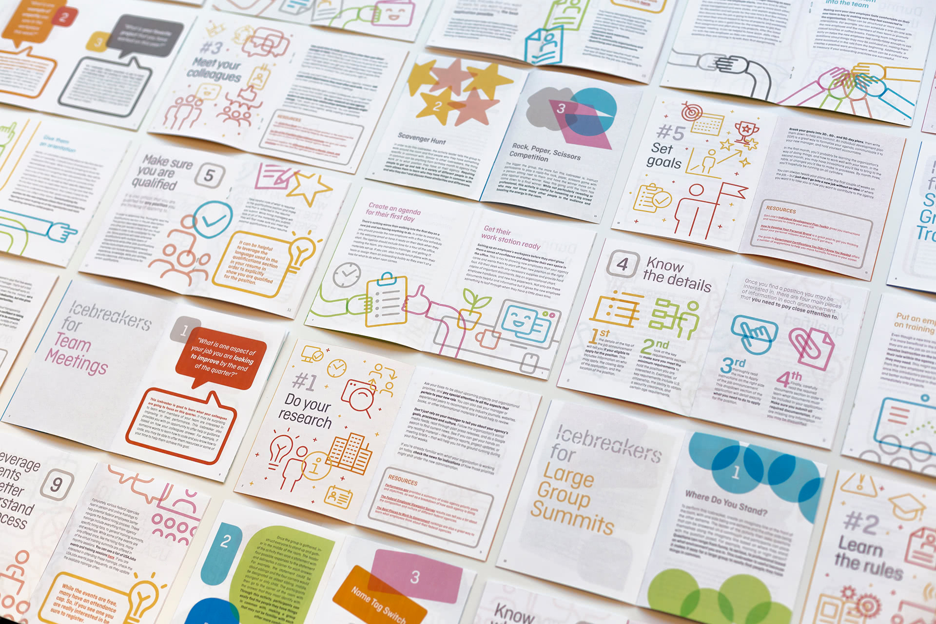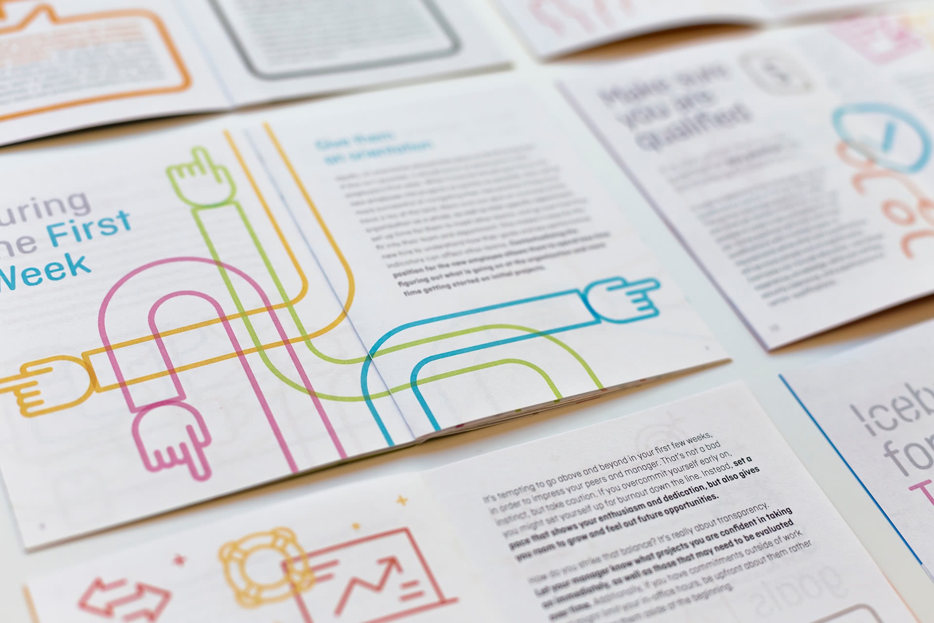 The publications make intensive use of the icon library, typeface, and color palette. These three ingredients combined creates a distinctive, clean, and charming style that invites an entertaining reading, which reinforces its inspirational aim.